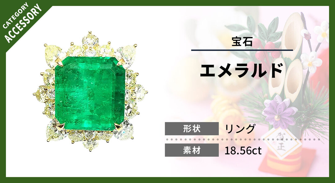 今回のお品物は、18.56ctという大粒サイズのエメラルドを主石に据えたリング。